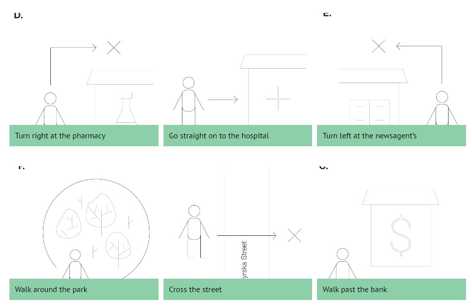 Вам потрібно йти прямо до газетного кіоску, а потім повернути ліворуч.
