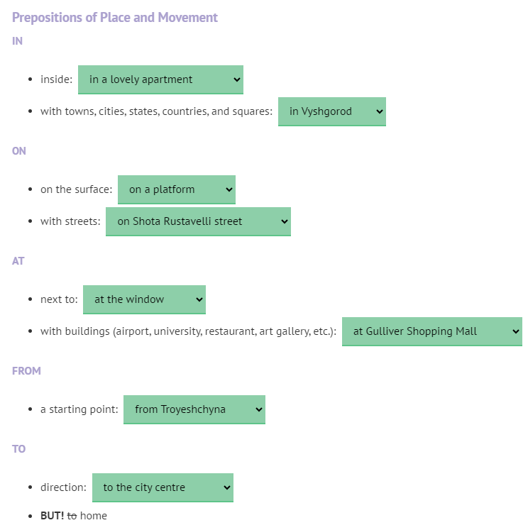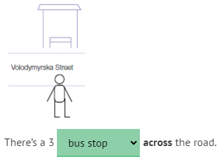 My apartment has got two rooms. There are two rooms in my apartment. У моїй квартирі дві кімнати. My apartment hasn't got a balcony. There isn't a balcony in my apartment. У моїй квартирі немає балкона. My apartment has got a study and two bedrooms. There is a study and two bedrooms in my apartment. У моїй квартирі є кабінет і дві спальні. My apartment building has got fifteen floors. Мій житловий будинок має п'ятнадцять поверхів. There are fifteen floors in my apartment building. У моєму будинку п'ятнадцять поверхів. My apartment building hasn't got an elevator. There isn't an elevator in my apartment building. У моєму будинку немає ліфта. My neighborhood has got a big supermarket. There is a big supermarket in my neighborhood. У моєму районі є великий супермаркет. My neighborhood has got two big parks. There are two big parks in my neighborhood. У моєму районі є два великих парки. My neighborhood hasn't got many coffee places. There aren't many coffee places in my neighborhood. У моєму районі не так багато кав'ярень. There’re some children in the daycare. У дитячому садку є кілька дітей. There aren’t any children in the playground. На майданчику немає дітей. There are beautiful flowers in the garden. У саду гарні квіти. There’re three elevators in my apartment building. У моєму будинку є три ліфти. There’s a girl in the swimming pool. У басейні дівчина. There’s a table, a chair and some shelves in the study. У кабінеті є стіл, стілець і кілька полиць. There’re two garages in the house. В будинку є два гаражі. There’s an armchair, a couch, and a coffee table in the living room. У вітальні — крісло, диван, журнальний(кофейний) столик. There’s a bathtub and some towels in the bathroom. У ванній кімнаті є ванна та декілька рушників. There’s a bed and an armchair in the bedroom. У спальні ліжко і крісло. There’s a stove, a microwave and a fridge in the kitchen. На кухні є плита, мікрохвильова піч, холодильник. There’re a lot of free parking spaces in front of my apartment building. Перед моїм будинком є багато безкоштовних паркувальних місць. Has your neighborhood got a daycare? Твій район має дитячий садок? My family lives in a big detached house. Моя сім’я живе в великому приватному будинку. I would like to live in an apartment building with a spacious study and my own parking space. Я б хотіла жити в багатоквартирному будинку з просторим кабінетом і своїм власним місцем для паркування. Is it your villa? Це – твоя вілла? Max rents a terraced house with its own small garden and a garage. Макс орендує будинок з терасою та зі своїм власним маленьким садом і гаражем. Our daughter is on the playground now. Наша донька знаходиться на дитячому майданчику зараз. I work in a pharmacy in my neighborhood. Я працюю в аптеці в своєм районі.