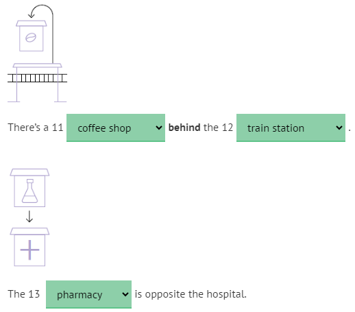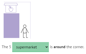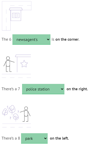 | Use it right! When you give directions, say: Turn right AT the pharmacy. Turn left AT the supermarket. When you talk about a location, say: The pharmacy is ON the right. The supermarket is ON the left. |