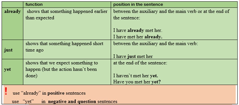 1. I`ve just called him / Я щойно йому подзвонив 2. I`ve already called him / Я вже йому подзвонив 3. I haven`t called him yet / Я ще йому не дзвонив 4. Have you called him yet? / Чи ти вже йому подзвонив? 5. She has just come / Вона тільки що прийшла. 6. I haven`t done it yet / Я ще не зробив це 7. Have you done it yet? / Ти вже зробив це? 1. I’m not hungry. I have had lunch already. / Я не голодний. Я обідав вже. 2. When did you see Joe last time? / Коли ти востаннє бачив Джо? 3. Has Jeff finished his project yet? / Чи закінчив Джеф свій проект вже? 4. I’ve seen this movie twice. / Я подивився цей фільм двічі. 5. My cousins have been here several times. / Мої двоюрідні брати були тут кілька разів. 6. Have you put the money in your bag? / Ти поклав гроші в сумку? 7. I haven’t had a shower yet. / Я ще не приймав(ла) душ. 8. Frank has caught only two fish. / Френк вловив лише дві риби.